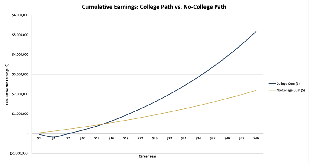 The payback period of 9 years means that by age 31, the nursing graduate has overtaken the cumulative wealth of the no college path. From that point forward, the advantage widens every year.