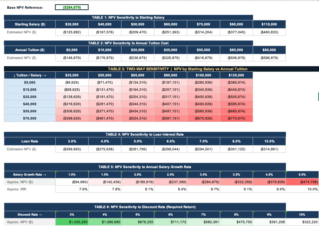 Every assumption in this analysis can be changed to reflect your actual situation. Different school costs, a higher or lower starting salary for your target market, a different loan amount, or a plan to pay out of pocket rather than borrow. The model recalculates everything when you update the inputs.